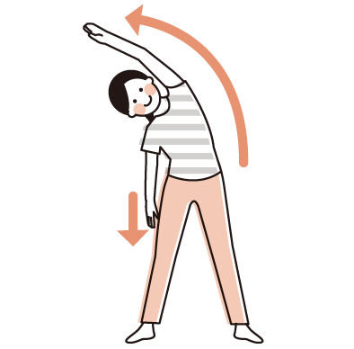 ・上げない方の手を膝に向けて下げ横腹を伸ばす