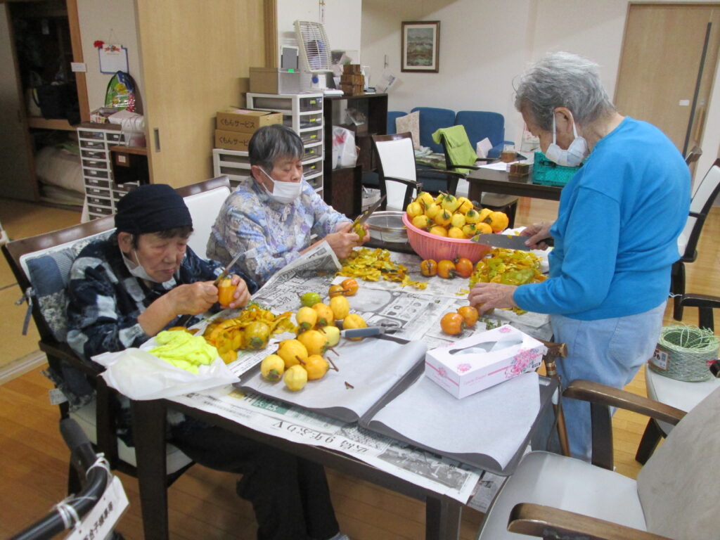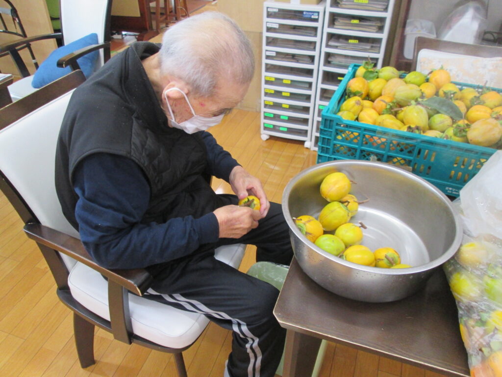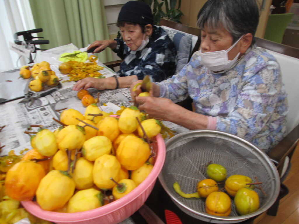利用者さんからたくさんの柿をいただいたので、皆で協力して干し柿づくりを行いました。手慣れたもので、あっという間に沢山剥いてくださり、中には「はよう食べたいなぁ」と言われる方もおり、今から楽しみにしている様子でした。