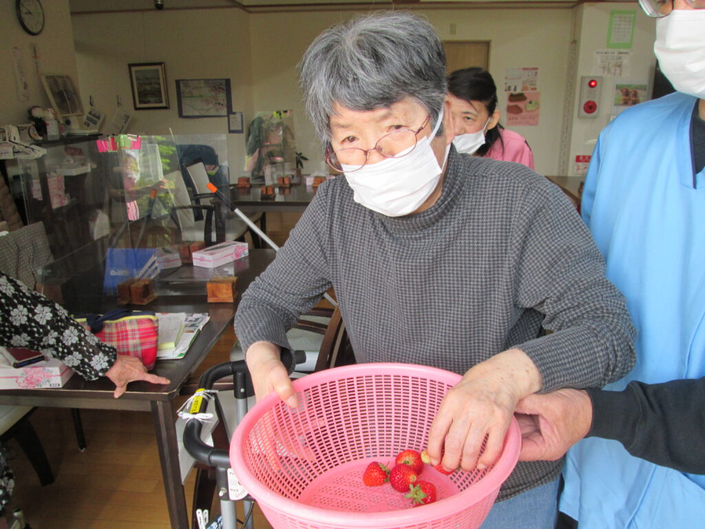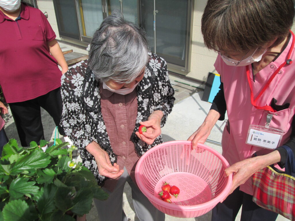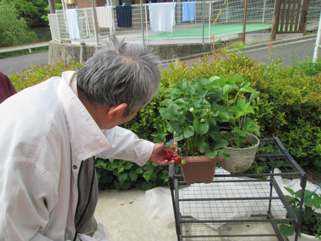 あかるい農村で育てていたイチゴが実りました。「はようたべたいなぁ~」と毎朝チェックされていた利用者さんに早速採っていただき、味見をしました。小ぶりだけれどちゃんと甘かったようで、おいしそうに召し上がられていました。玉ねぎやグリーンピースなども、もうそろそろ収穫できそうです!