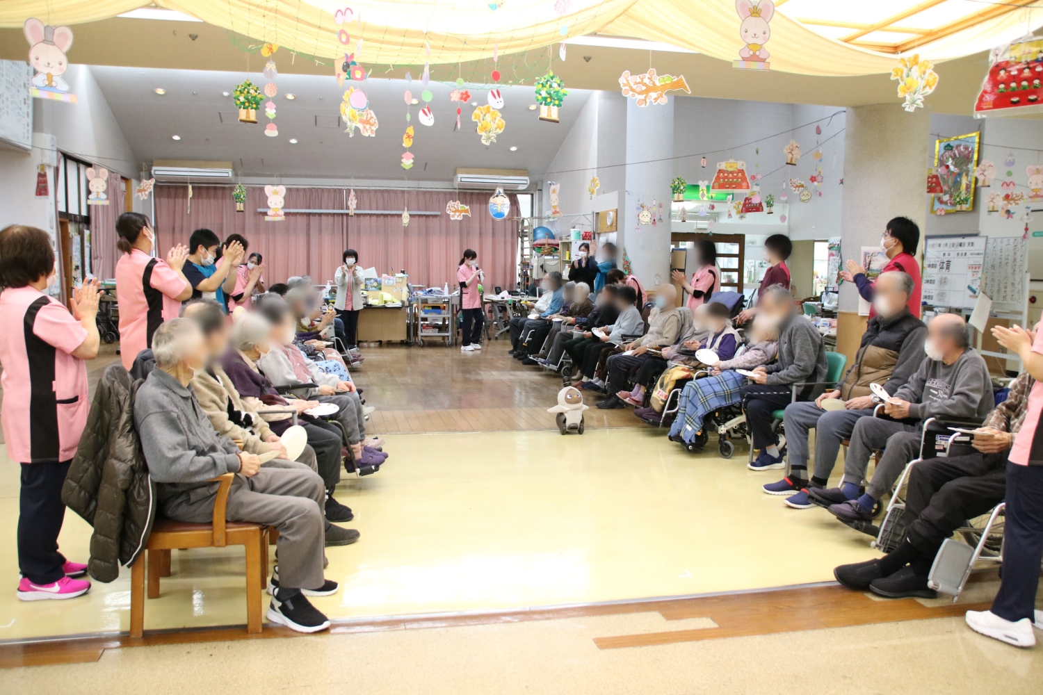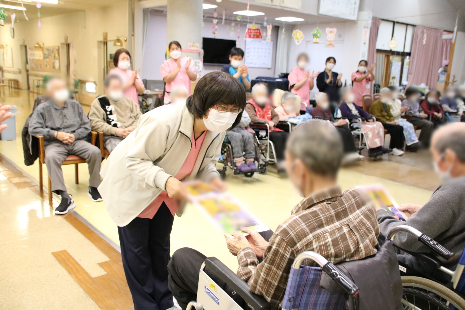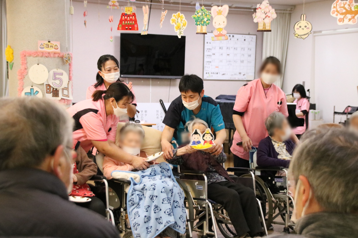 列に並んで、お皿に乗った雛人形を隣の人へと渡していくゲームを行いました。倒れないようにバランスを取るのがなかなか難しいのですが、皆さんとてもスムーズにクリアされ、途中からは難易度を上げて楽しみました。